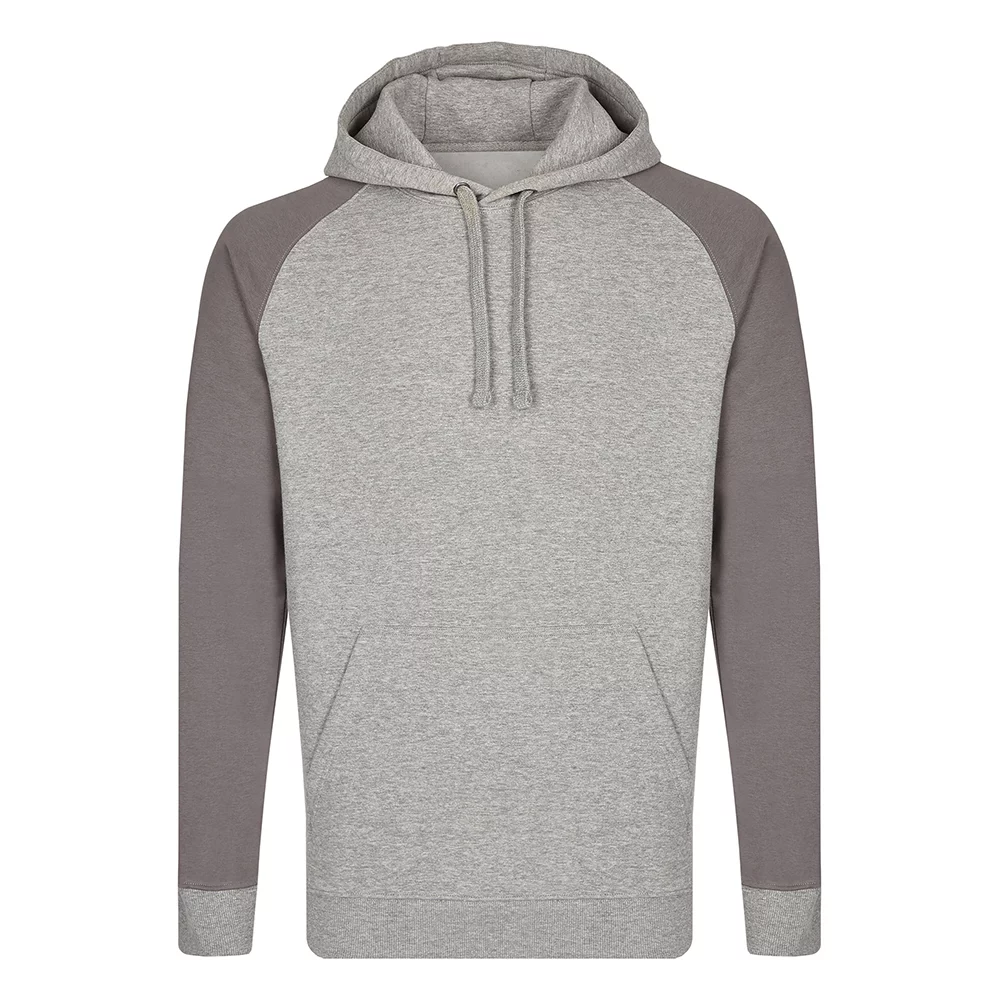 Moderner Hoody aus ringgesponnener Baumwolle, 3-teilige, doppellagige Kapuze für besseren Tragekomfort, flache Kordel, Kängurutasche, Ärmelabschlüsse und Bund aus 2x1 Ripp-Strick und Raglan-Ärmel.