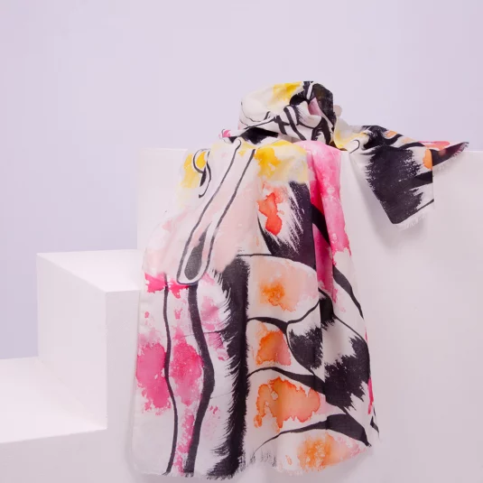Schal aus GOTS zertifizierter Bio-Baumwolle mit All Over-Aufdruck, Längskanten mit Plattsausm oder Abschluss mit Fransen, nach Ihren Wünschen umgesetzt.