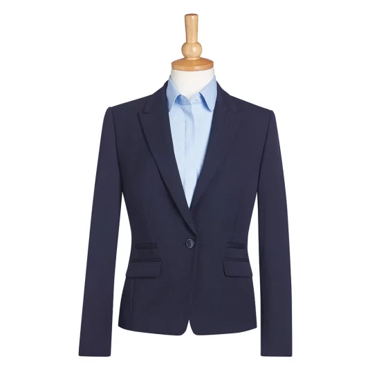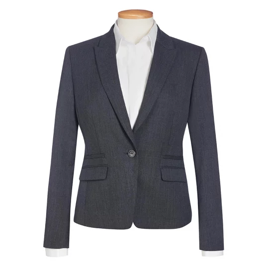 Kurzer, schmal geschnittener Blazer mit 1 Knopf in der vorderen Mitte, zwei eingeschnittene Paspeltaschen, zwei Taschen, eine Innentasche, modisch abgenähter Rücken, maschinell waschbar und knitterarm.