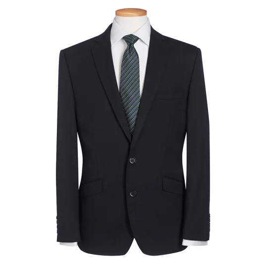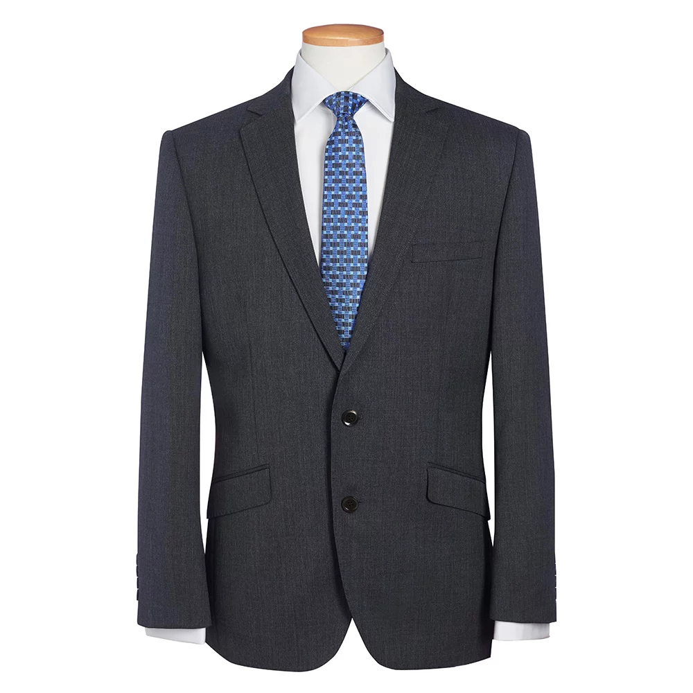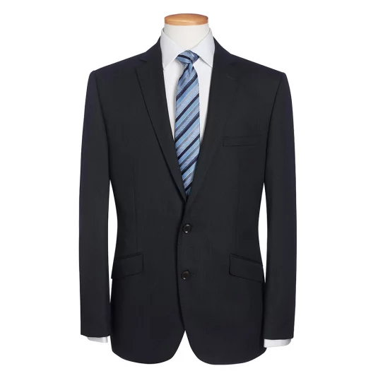 Schmal geschnittener Sakko mit einer Brustleistentasche, 2 Knöpfen in der vorderen Mitte, schmales Revers mit abgesteppter Naht, zwei seitliche Schlitze im Rückenteil, maschinell waschbar und knitterarm.