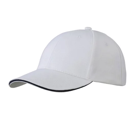 6 Panel Sandwich Cap, 6 gestickte Luftlöcher, 6 Ziernähte am Schild, laminierte Frontpanels, gefüttertes, Satinschweissband, Metallclipverschluss in Messing mit gestickter Öse