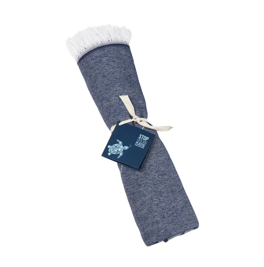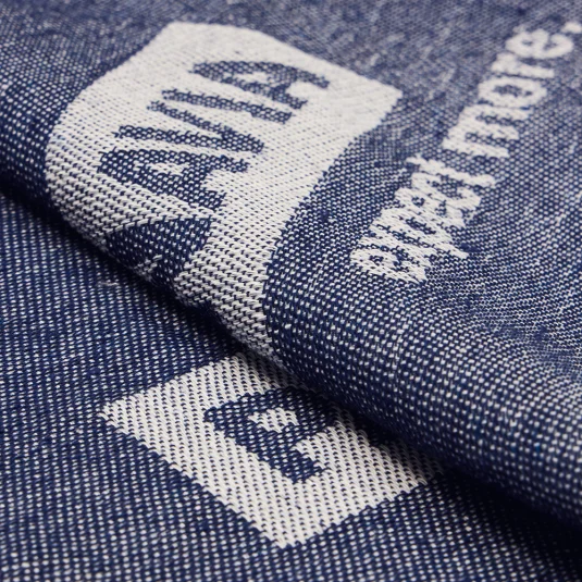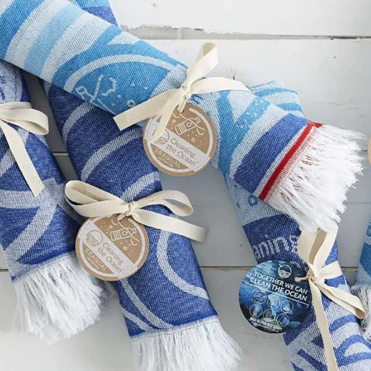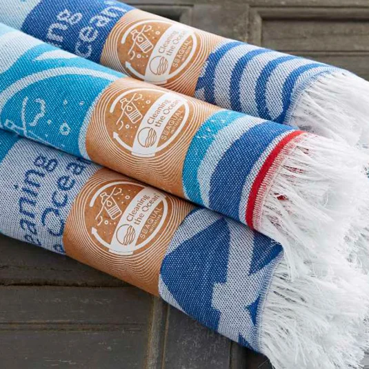 Mit diesem Tuch helfen Sie die Ozeane vom Plastik zu befreien. Der Produzent arbeitet mit einem Netzwerk von Fischern zusammen, die ihren Plastik-Beifang sammeln, so dass dieser Beifang zu recycelten PET-Garnen verarbeitet werden kann. Diese Garne tragen den Namen SEAQUAL™ und werden mit recycelter Baumwolle kombiniert. So entsteht ein 100% recyceltes Tuch, welches in Ihrem Wunschdesign jacquard–gewoben wird. Zweifarbige Volltoneinwebung, wobei das Motiv jeweils weiss dargestellt wird. Wird als Rolle verpackt und mit individuellem Hangtag oder Banderole geliefert. Produziert in Spanien. Mindestbestellmenge: 250 Stück