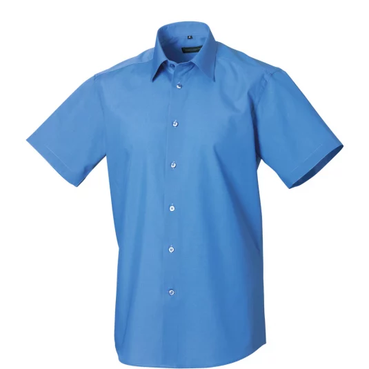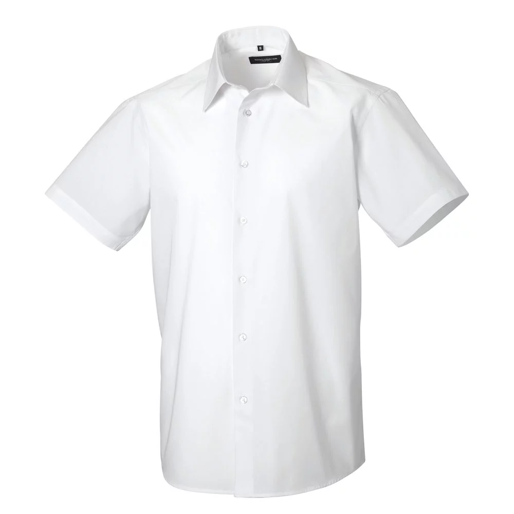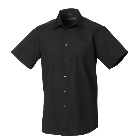 Kurzärmliges Herrenhemd im tailliertem Schnitt, stäbchenverstärkter Kragen, doppelt umgelegter Ärmelsaum, abgerundeter Saum