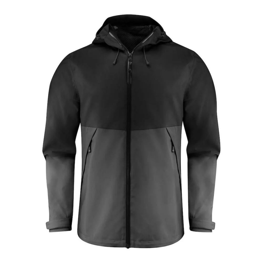 Zweifarbige Shell Jacke mit geklebten Nähten. wasserdichter Reissverschluss und abgedeckte Seitentaschen mit Reissverschluss. Ärmelabschluss mit verstellbarem Klettverschluss. Mesh Innenfutter mit linker Innentasche und Veredelungsreissverschluss. Reflektierendes Detail am Rücken. Kapuze und Saum sind mit elastischen Kordeln verstellbar.