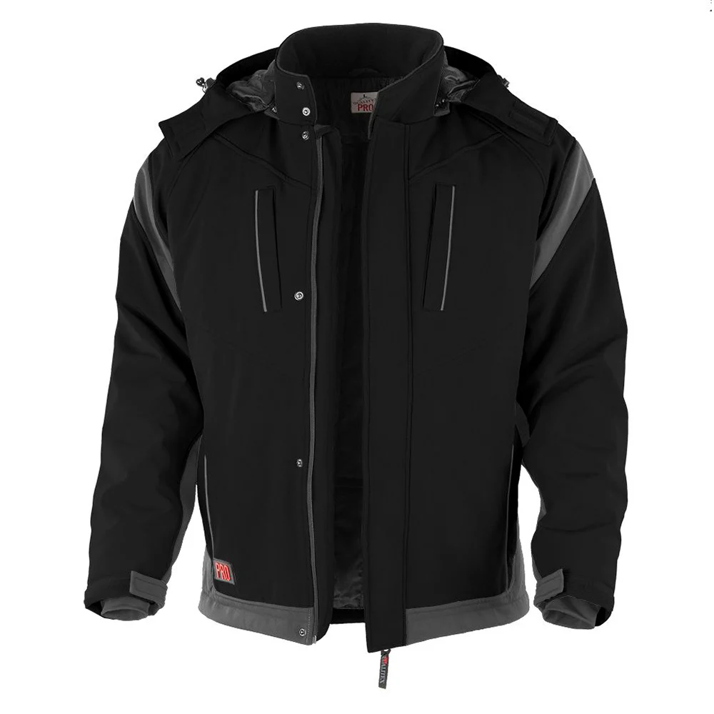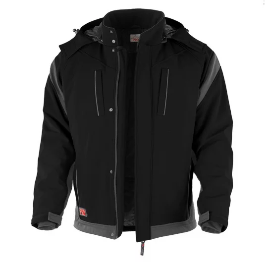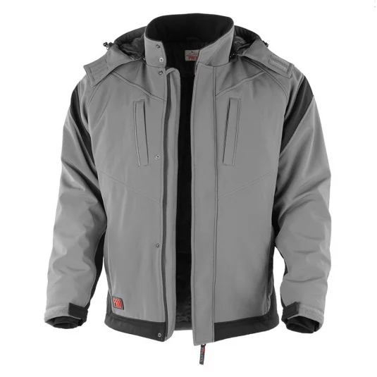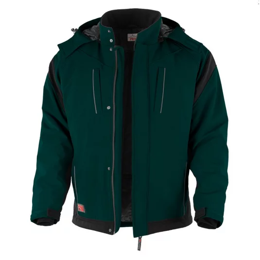 Softshelljacke mit abnehmbarer Kapuze, Stehkragen mit 2 Druckknöpfen, 2 Brusttaschen und 2 Seitentaschen mit verdecktem Kunststoff-Reissverschluss, verdeckter Einweg YKK-Reissverschluss mit Kinnschutz und 4 Druckknöpfen, Reflexstreifen.