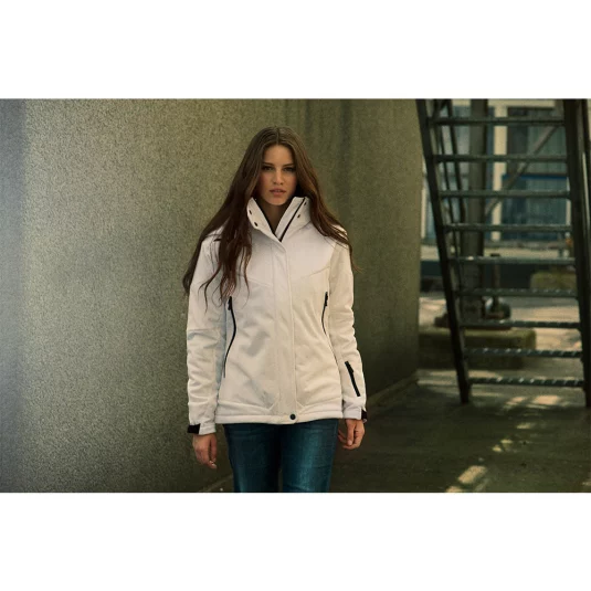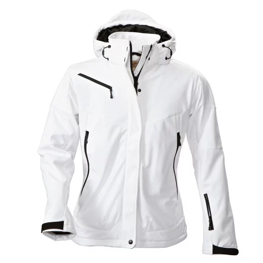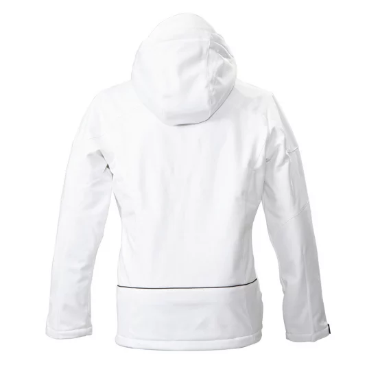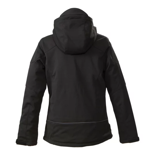 Gefütterte Softshelljacke für Damen mit abnehmbarer Kapuze, ergonomisch geformten Ärmeln, Kordelzug im Bund und Klettverschlüssen an den Ärmelenden.