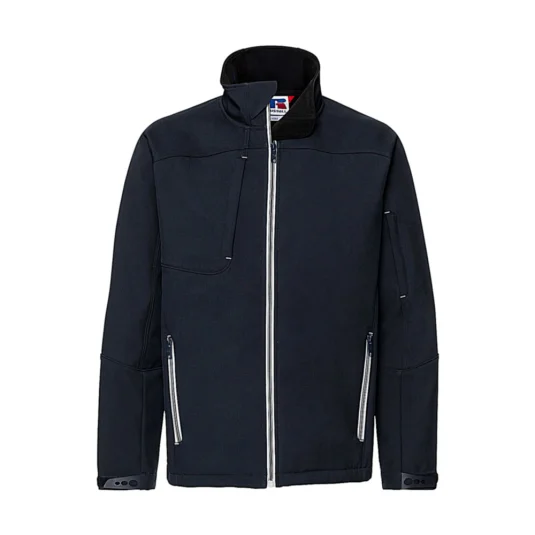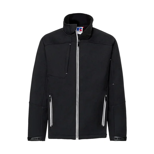 Bionic-Finish® Eco (3-lagige Softshell mit hydrophober Membran), Fluor und PFC frei, Wind- und wasserdicht (5000 mm), Atmungsaktiv (5000 g/m² in 24h), Stehkragen, Hydroshell Air Einsätze im Achselbereich, Brust-, Arm- und Seitentaschen mit Zip, Media-Netztasche innen, verstellbare Ärmelbündchen.