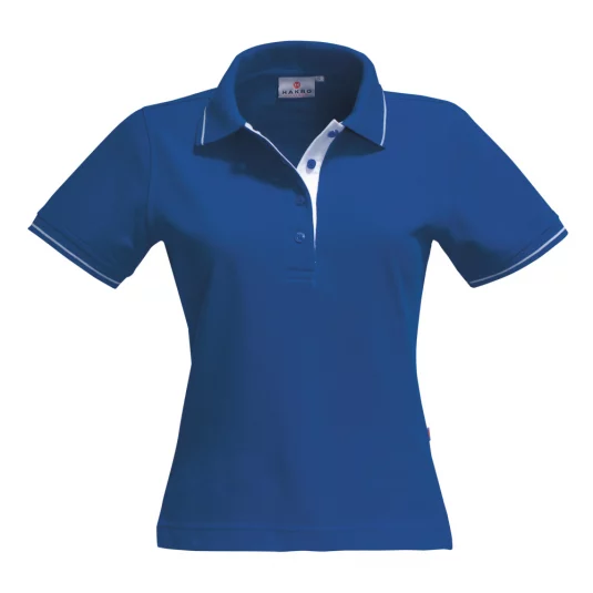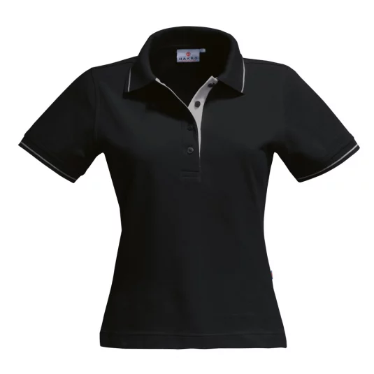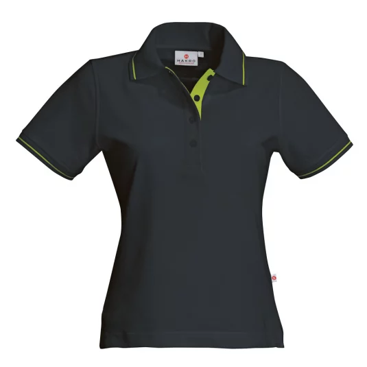 Hochwertiges Damen-Poloshirt, kontrastfarbig unterlegte Knopfleiste, Knöpfe "Ton in Ton", Nackenband, Seitenschlitze, Kontraststreifen im Polokragen und an den Armbündchen.