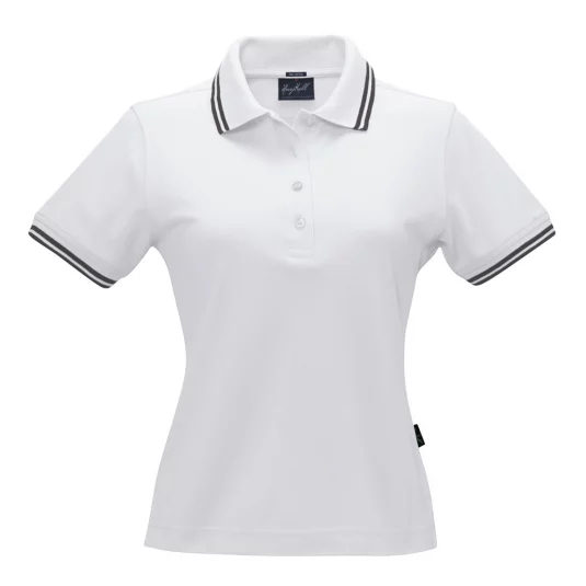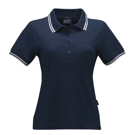 Damen Poloshirt aus feinmaschigem Baumwoll-Piqué mit schmalen Kontrastreifen, körperbetonte Schnittführung.