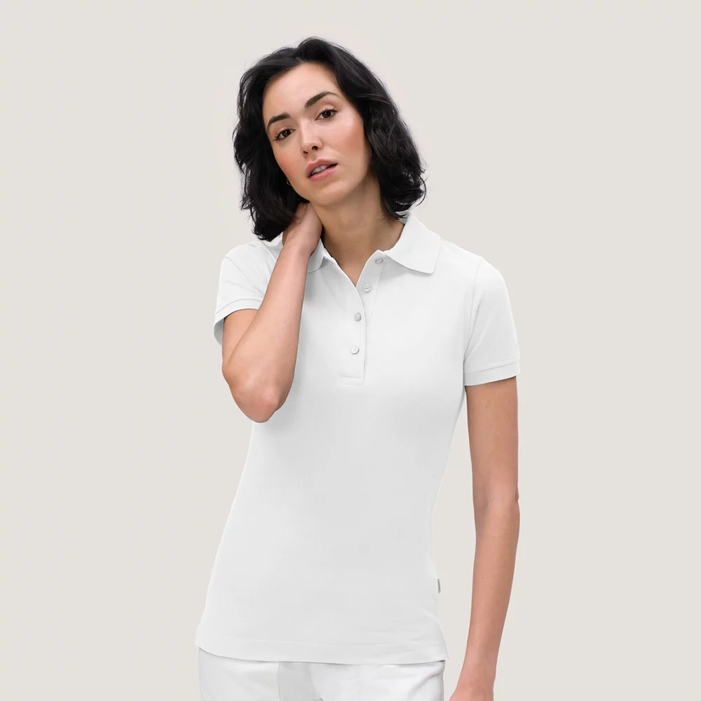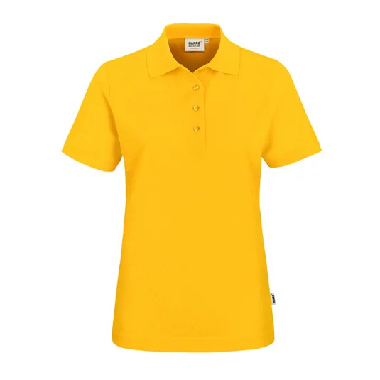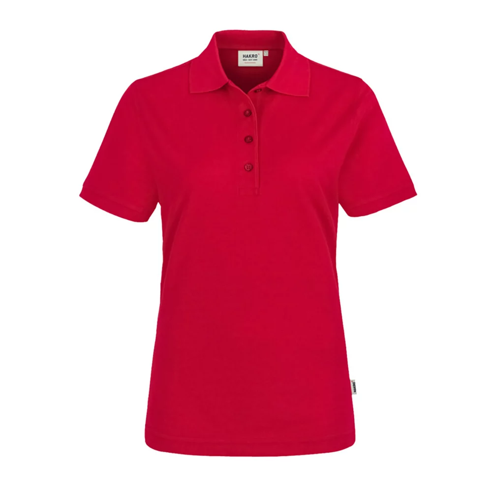 Besonders strapazierfähiges Poloshirt für Damen, mit hochwertig verarbeiteter, modischer 4-Loch-Knopfleiste mit extra haltbar angenähten, bruchsicheren Knöpfen, Ton-in-Ton mit dem gelaserten HAKRO Schriftzug.