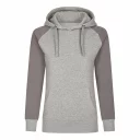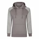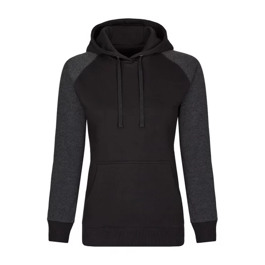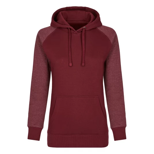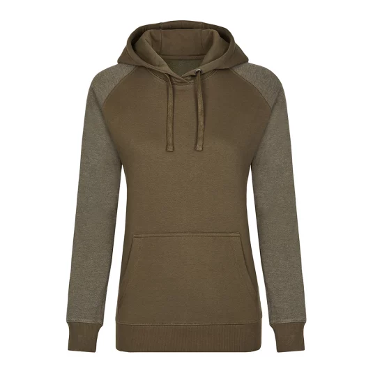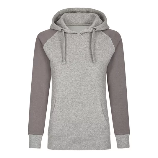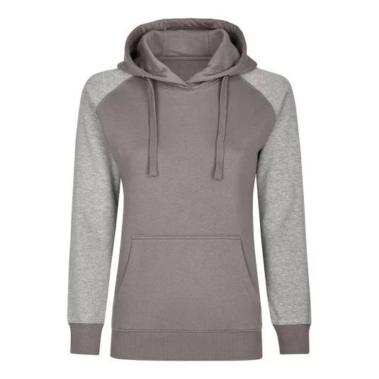 Moderner Hoody aus ringgesponnener Baumwolle, 3-teilige, doppellagige Kapuze für besseren Tragekomfort, flache Kordel, Kängurutasche, Ärmelabschlüsse und Bund aus 2x1 Ripp-Strick und Raglan-Ärmel.