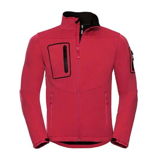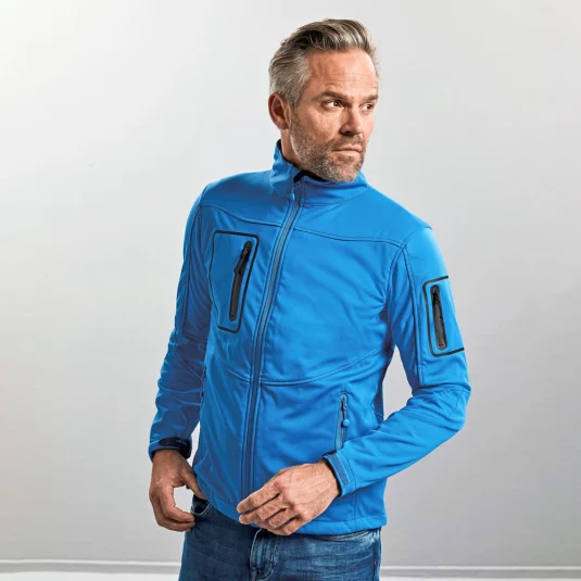 3-layer sports shell jacket with pre-shaped elbows, welded laser-cut pockets, welded hydrophobic membrane.