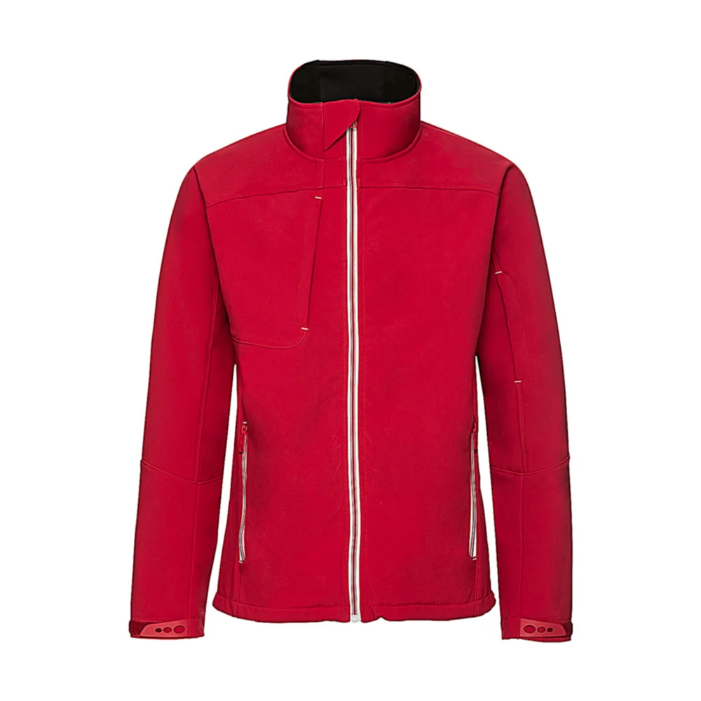 Bionic-Finish® Eco (3-layer softshell with hydrophobic membrane), fluorine and PFC free, wind and waterproof (5000 mm), breathable (5000 g/m² in 24h), stand-up collar, Hydroshell Air inserts in the underarm area, zipped chest, arm and side pockets, inner media mesh pocket, adjustable cuffs.
