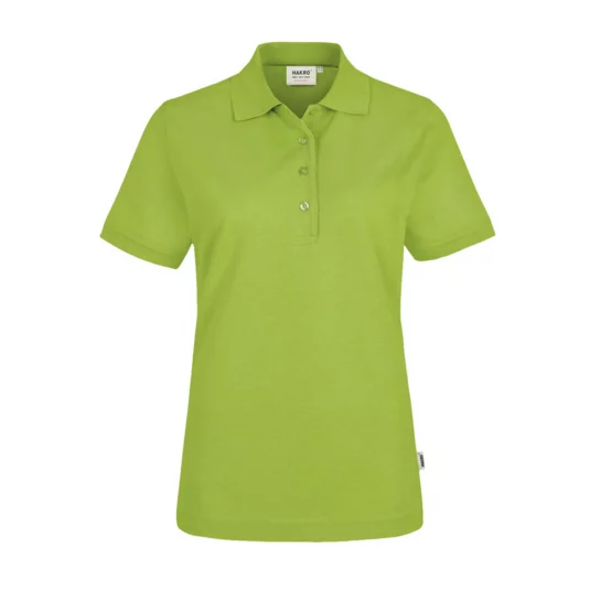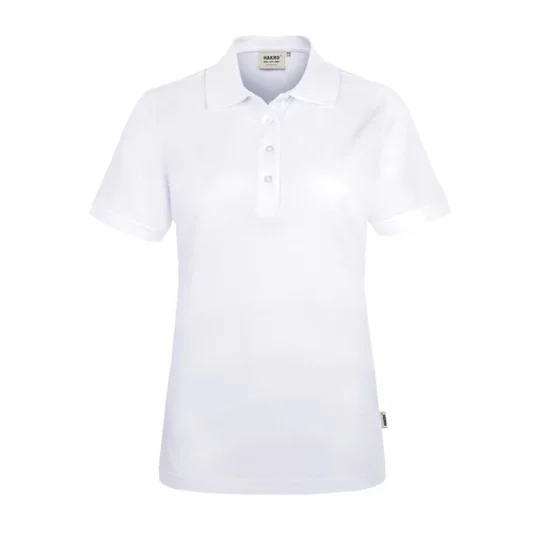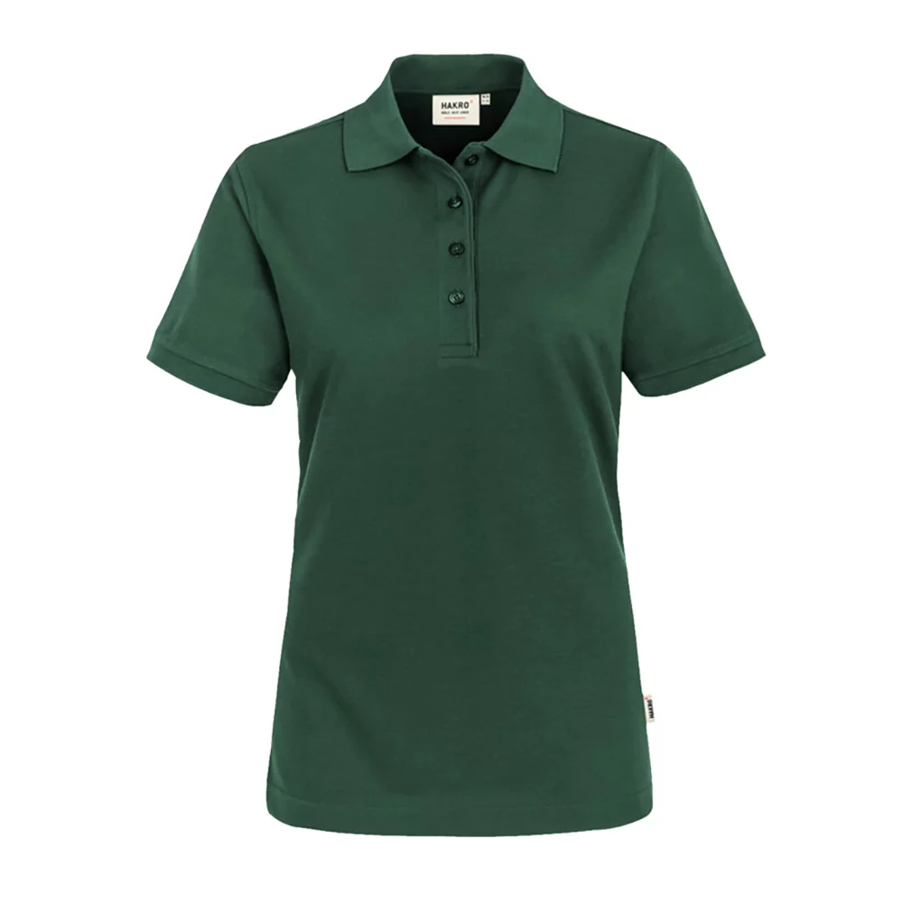 Extra-durable polo shirt for women with high-quality, stylishly narrow 4-hole button strip with extra-durably sewed on, break-resistant buttons, tone-on-tone with the lasered HAKRO lettering.