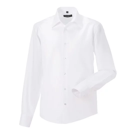 Chemise homme à manches longues, coupe serrée, textile non repassable, col renforcé à moitié relevé, ourlet arrondi