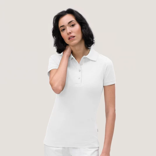 Polo pour femmes particulièrement résistant avec patte de boutonnage à 4 trous tendance de grande qualité, avec boutons incassables à fixations ultra résistantes, ton sur ton avec lettrage HAKRO gravée au laser.