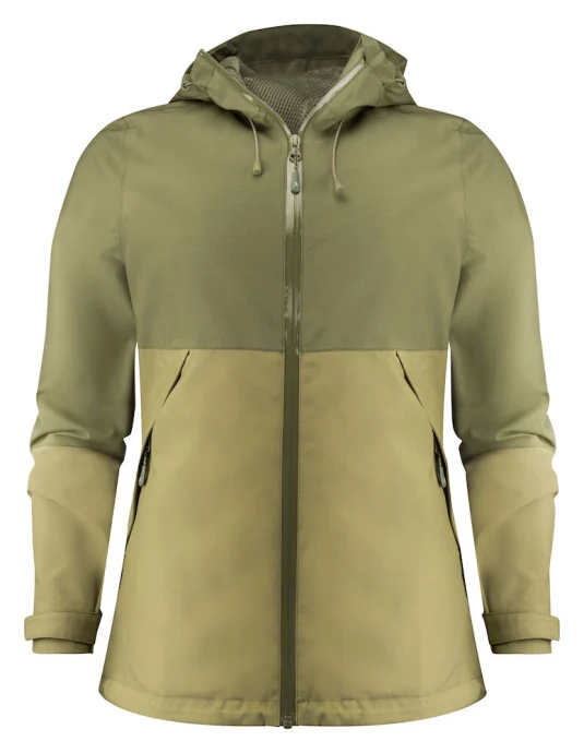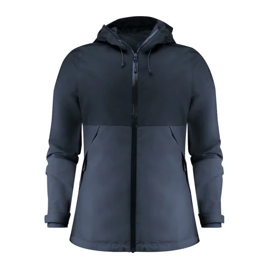 Veste imperméable moderne pour femmes avec capuche comme élément du concept de superposition. Veste shell bicolore avec coutures collées. Fermeture à glissière étanche et poches latérales couvertes avec fermeture à glissière. Bas des manches avec fermeture velcro réglable. Doublure intérieure en mesh avec poche intérieure gauche et fermeture éclair de finition. Détail réfléchissant au dos. La capuche et l'ourlet sont réglables avec des cordons élastiques.